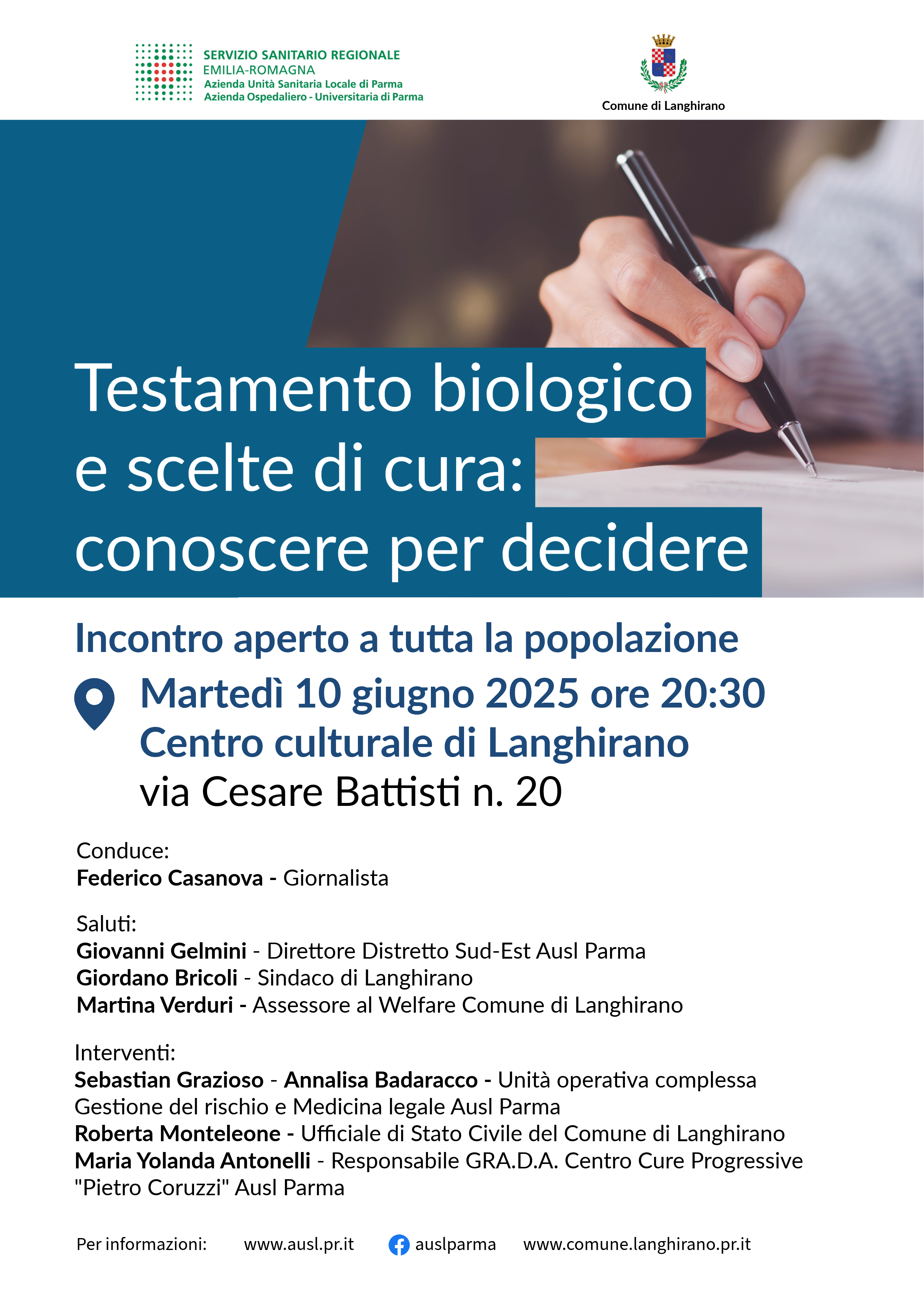 Invito all'incontro pubblico: "Testamento biologico e scelte di cura – conoscere per decidere"