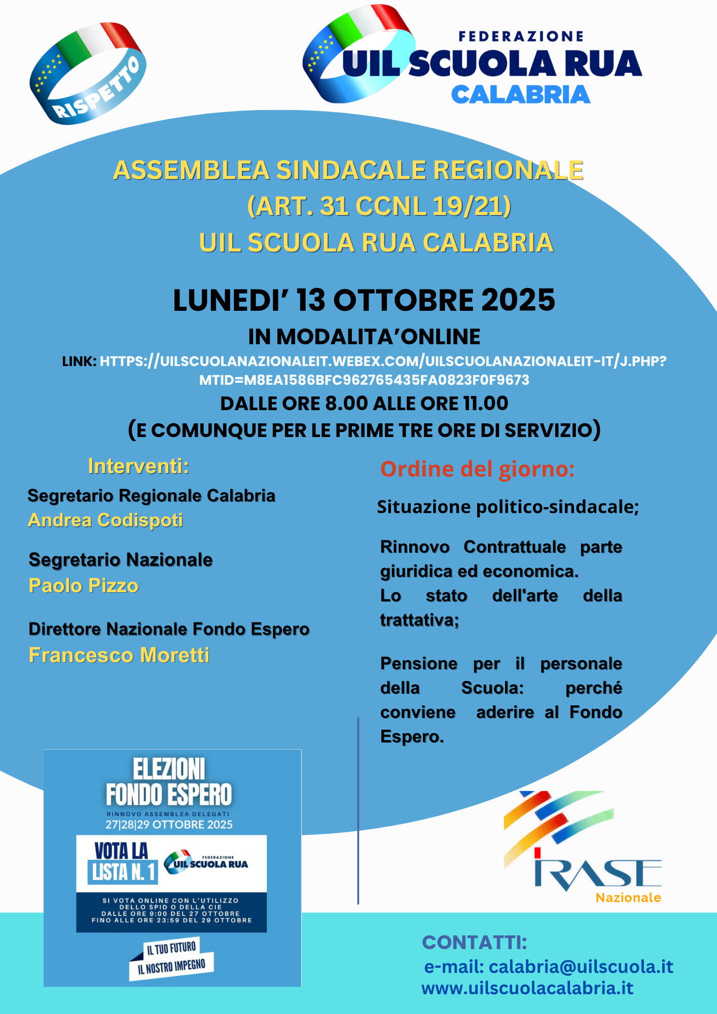 POSTA CERTIFICATA: INTEGRAZIONE/PRECISAZIONE INDIZIONE ASSEMBLEA SINDACALE REGIONALE IN SERVIZIO DA PARTE DELLA UIL SCUOLA RUA CALABRIA IN ORARIO DI SERVIZIO DA SVOLGERSI IN MODALITA’ ONLINE PER TUTTO IL PERSONALE DELLA SCUOLA DEL 13/10/2025