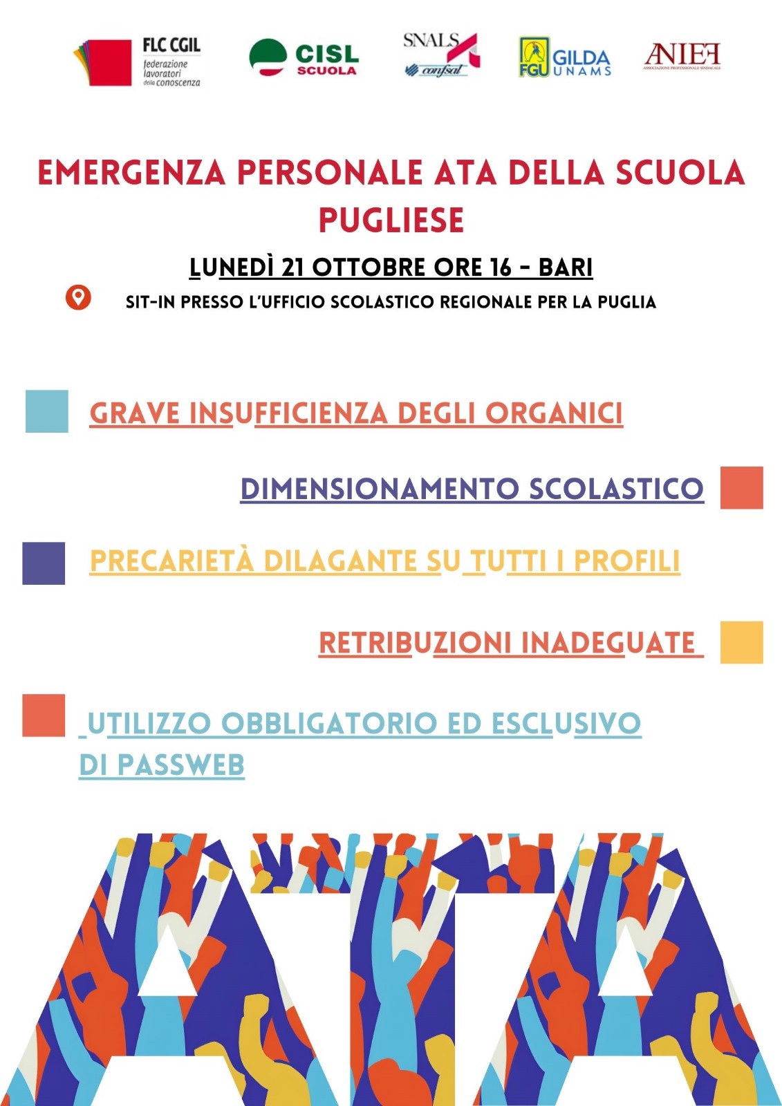 Lunedì 21 ottobre, ore 16: presidio unitario del personale ATA della Puglia davanti all'Ufficio Scolastico Regionale
