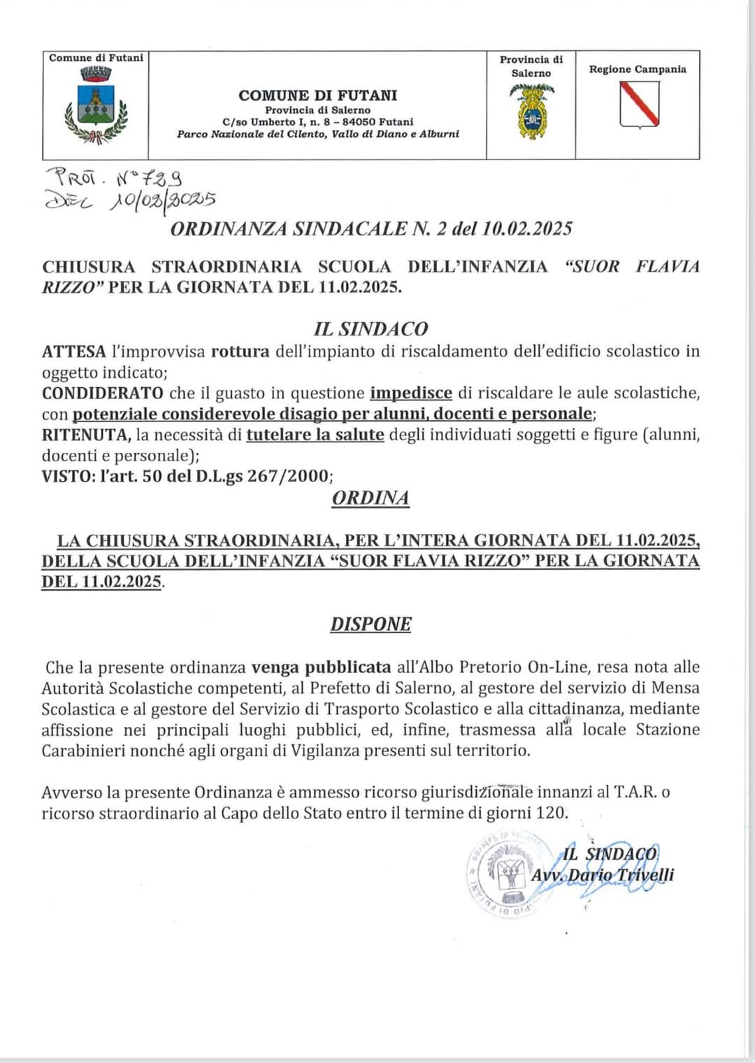 Ordinanza sindacale chiusura scuola infanzia nella giornata dell' 11 febbraio 2025.