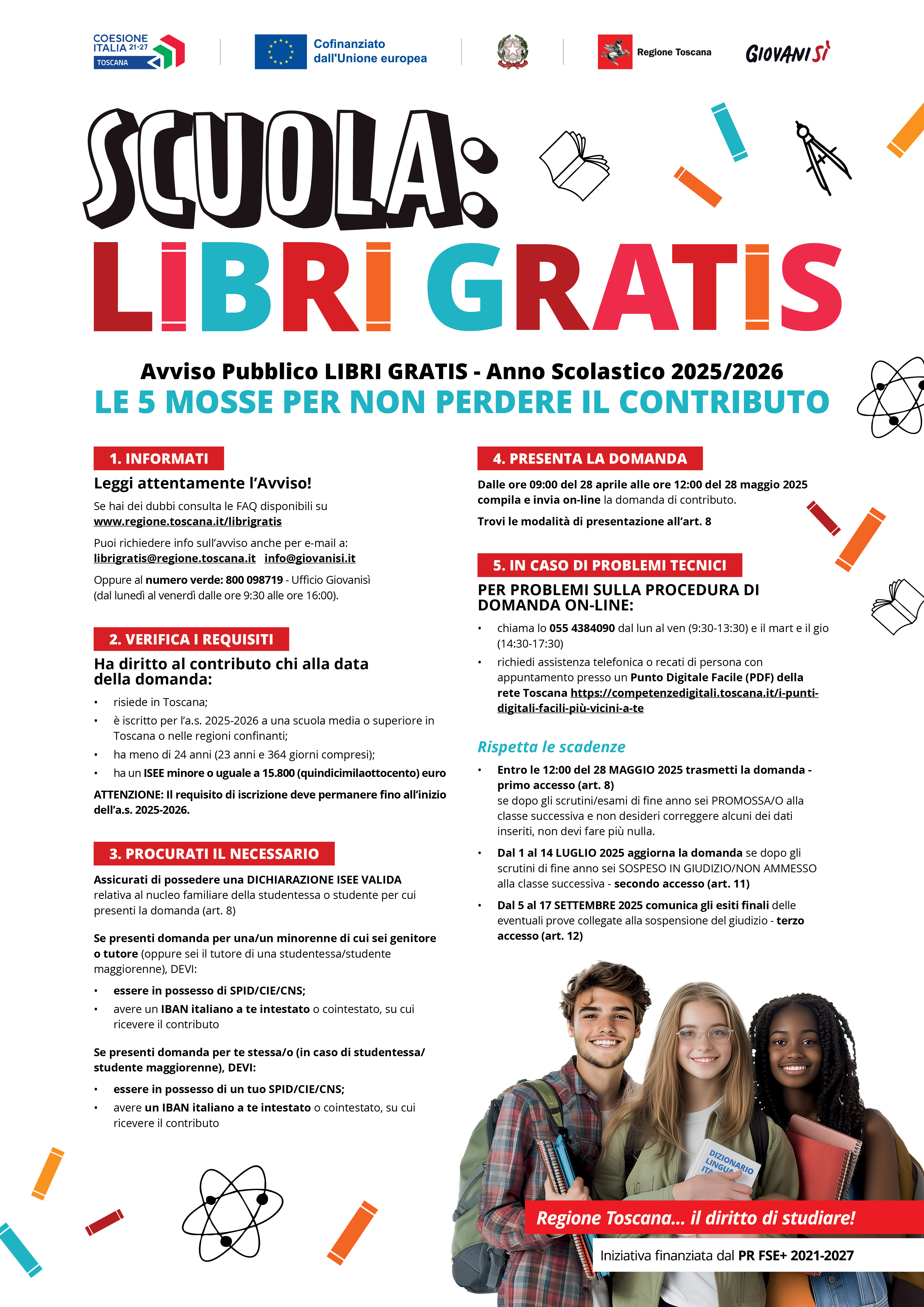 domande entro oggi alle ore 12 - "Libri Gratis"- Iniziativa di Regione Toscana a sostegno dell'istruzione secondaria di primo e secondo grado