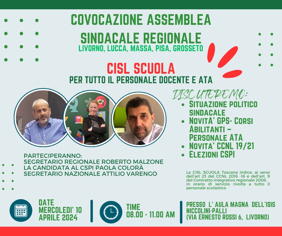 ASSEMBLEA SINDACALE REGIONALE CISL PER TUTTO IL PERSONALE SCOLASTICO MERCOLEDI 10 APRILE ORE 8-11 PRESSO L'AULA MAGNA DELL'ISIS NICCOLINI PALLI LIVORNO