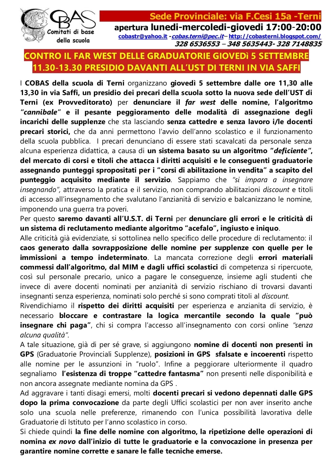 com. sindacale 5.09 presidiodocenti precari UST TERNI