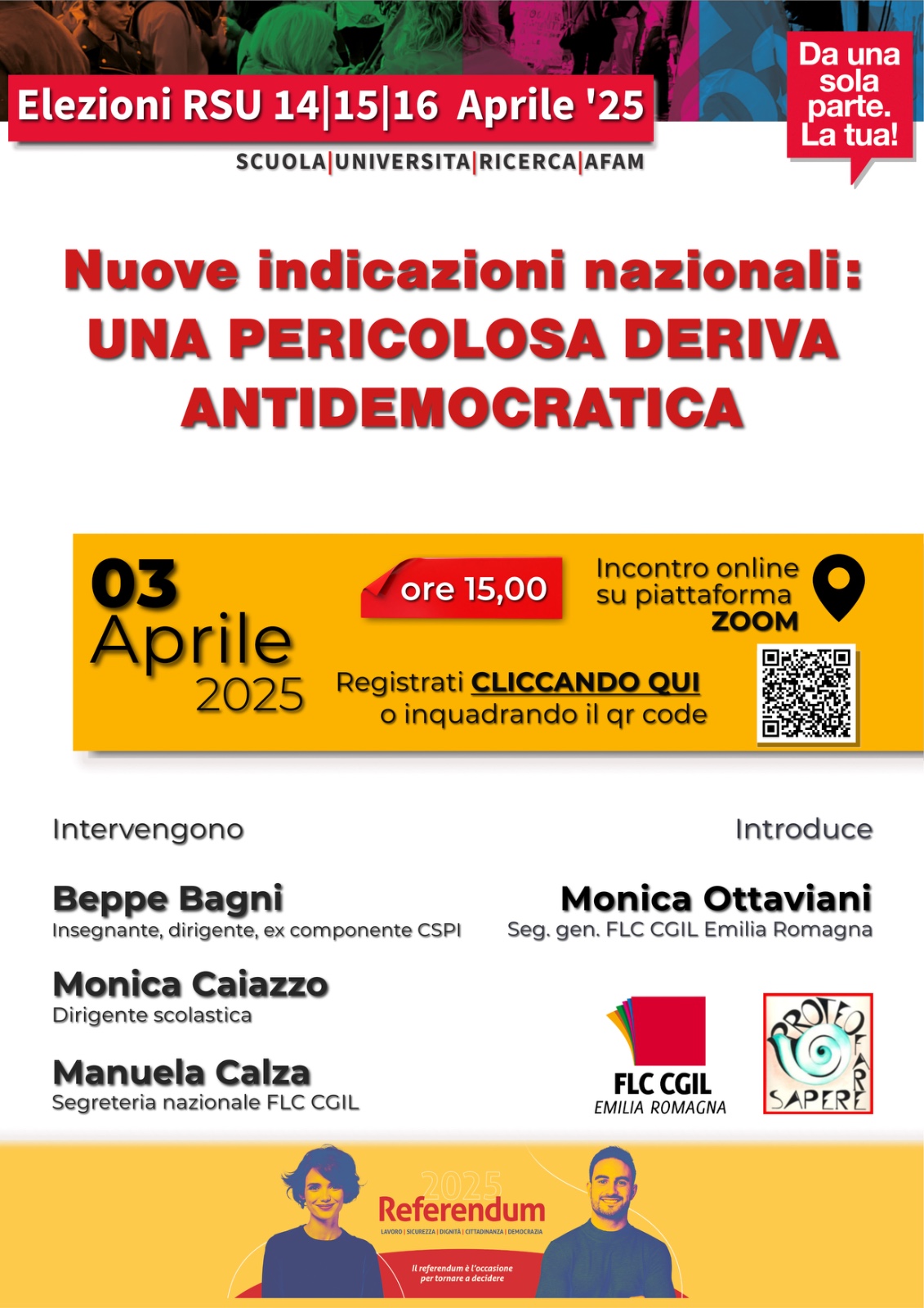 FLC CGIL EMILIA ROMAGNA e PROTEO FARE SAPERE: INCONTRO ON LINE 3 APRILE 2025 - "Nuove indicazioni nazionali: UNA PERICOLOSA DERIVA ANTIDEMOCRATICA"