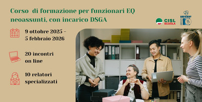 Corso di formazione per funzionari EQ neoassunti con incarico DSGA, venti incontri dal 9 ottobre al 5 febbraio